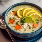 This classic Avgolemono Greek Lemon Chicken Soup features tender chicken simmered with aromatic vegetables, rice, and a luscious lemon-egg sauce for a creamy, comforting, and tangy Mediterranean flavor. Perfect as a hearty starter or a light meal, this traditional recipe combines fresh lemon juice and eggs for a velvety texture that elevates a simple chicken broth into a deliciously vibrant and nourishing soup.
