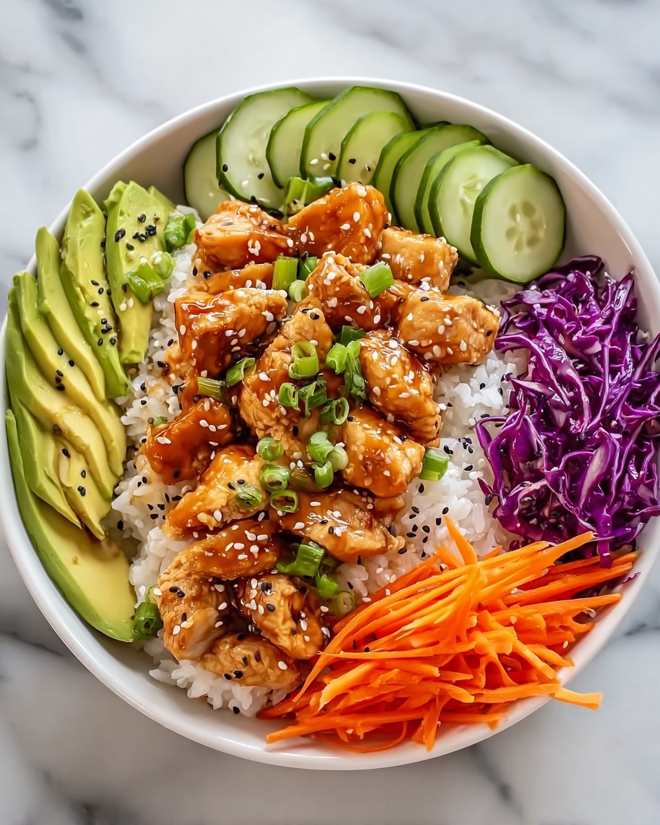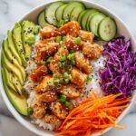 Now for the fun part. Start with a warm scoop of fluffy white rice in each bowl. Layer on the thinly sliced red cabbage, julienned carrot, cool cucumber slices, and creamy avocado. Top it off with the cooked chicken cubes and generously drizzle your homemade bang bang sauce over everything. Finish with a sprinkle of fresh cilantro and sesame seeds to add brightness and a final touch of texture.