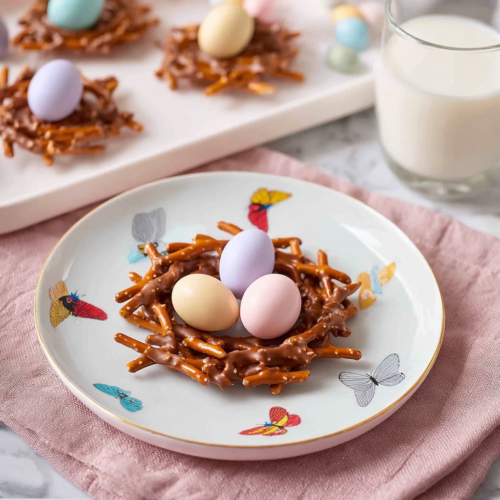Arrange your nests on a bed of shredded green paper or edible grass on a decorative platter to mimic a real bird’s nest scenario. You can also place each one inside small cupcake liners for easy individual servings, making them perfect for kids’ parties or Easter brunch.