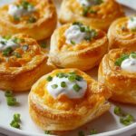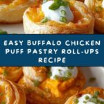 Buffalo Chicken Roll-Ups are a spicy and creamy appetizer featuring shredded rotisserie chicken mixed with cream cheese, mozzarella, cheddar, and buffalo sauce, all wrapped in flaky puff pastry and baked to golden perfection. Topped with extra buffalo sauce, ranch dressing, and fresh parsley, these roll-ups make a flavorful party snack or game day treat.