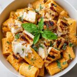 - Slice and serve: Slice the cooked chicken into strips and arrange on top of the creamy rigatoni. Garnish generously with extra Parmesan cheese, red pepper flakes, and the remaining fresh basil. Serve immediately and enjoy!