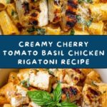A flavorful and comforting Burst Cherry Tomato Basil Chicken Rigatoni recipe featuring tender seared chicken breasts, al dente rigatoni pasta, and a creamy, tangy tomato sauce infused with fresh basil and Parmesan cheese. This dish combines the freshness of cherry tomatoes bursting in the pan with the richness of heavy cream and the aromatic notes of Italian seasoning, making it a perfect weeknight dinner for six.