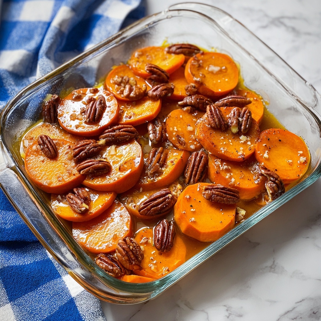 Transfer the glazed sweet potatoes into a greased 9×13-inch baking dish, then drizzle any remaining syrup from the pan over the top for extra caramelization. Sprinkle chopped pecans evenly if you’re using them—they add a lovely texture contrast. Bake in the preheated oven for 25 to 30 minutes, stirring halfway through so each bite can bask in the syrupy coating and become tender with a beautifully thickened glaze.