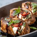 A delicious Italian-inspired main course featuring chicken breasts stuffed with fresh mozzarella, tomato, and basil, seared to golden perfection, then baked to juicy tenderness and drizzled with balsamic glaze for a flavorful finish.