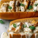 Chicken Alfredo Stuffed Garlic Bread Subs combine tender grilled chicken tossed in creamy Alfredo sauce with melted mozzarella and Parmesan cheeses inside garlic buttered sub rolls. These comforting and flavorful subs are baked until the bread is crispy and the cheese is perfectly melted, making for a delicious and hearty meal.