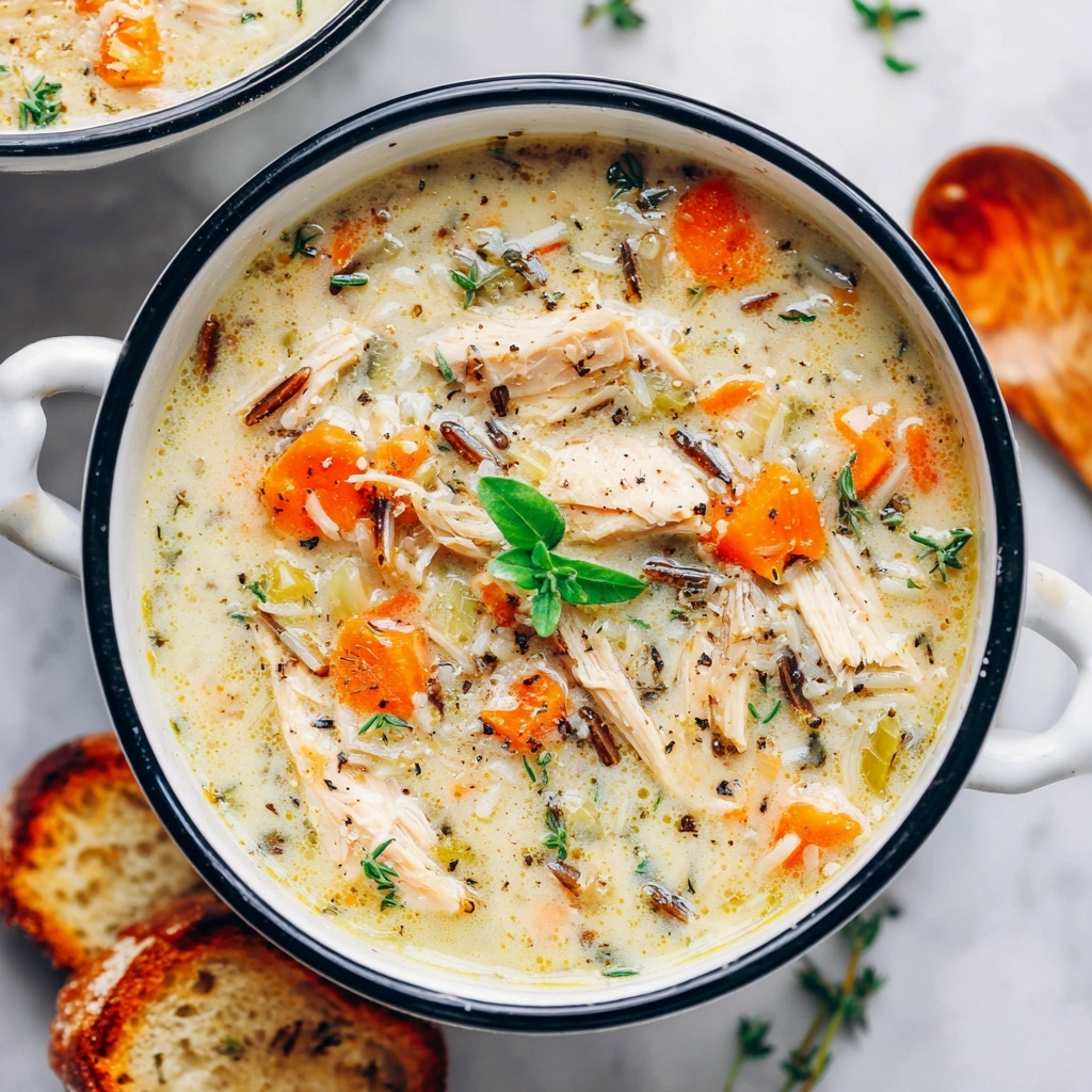 Serve your Chicken and Wild Rice Soup Recipe in rustic bowls that keep the soup warm, accompanied by a small dish of freshly grated Parmesan or crumbled feta for guests to sprinkle on top. You can also turn this soup into a fun event by setting up a “soup bar” with various toppings like crispy bacon bits, shredded cheese, sliced green onions, and fresh herbs.