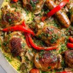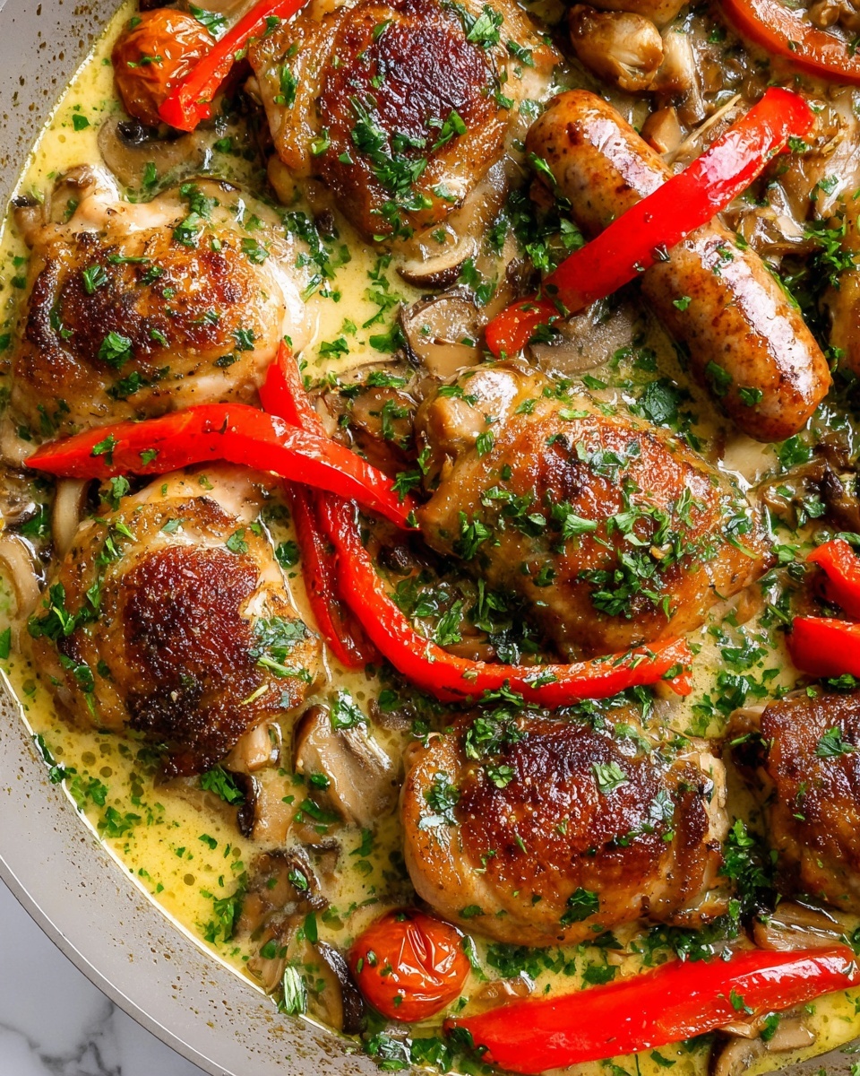 Return the chicken and sausage back to the pan, nestling them into the sauce. Bring everything to a gentle simmer, reduce the heat to low, and cover. Let it cook for 25–30 minutes so the chicken becomes tender and fully infused with those bold flavors. Uncover and simmer for another 5–10 minutes without the lid to let the sauce thicken slightly. The aroma at this stage is truly irresistible.