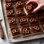 7. Top with Chocolate and Optional Pretzels: Pour the melted chocolate over the caramel layer and spread it evenly using a spatula. If desired, sprinkle extra pretzel pieces on top for added crunch and decoration.