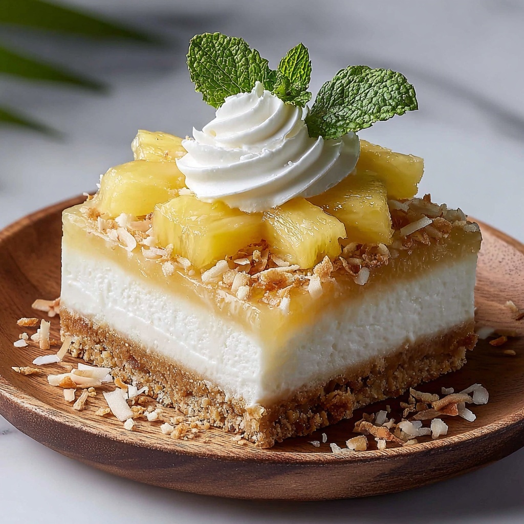 Presentation is all about creating a tropical vibe. Consider serving individual portions in clear glasses layered with crushed graham crackers, pineapple bits, and cheesecake filling for a sophisticated parfait twist. Alternatively, use colorful tropical plates or even edible flowers to elevate the visual appeal. You can also drizzle a little pineapple syrup or toasted coconut cream on the side for added flair.