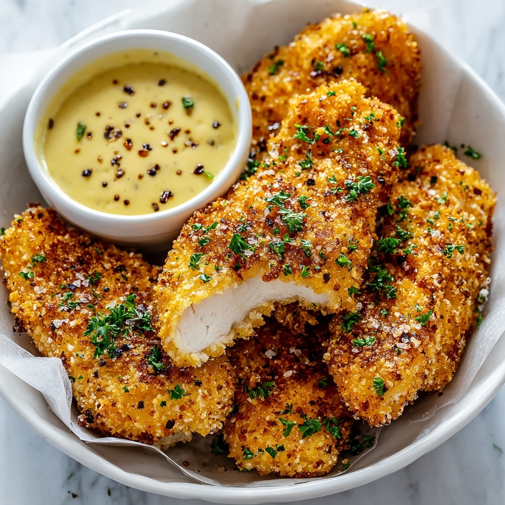 Take each seasoned tender and first dredge it in the flour, coating evenly to help the egg wash stick better. Next, dip the chicken into the beaten eggs, and finally, press it firmly into the breadcrumb-cheese-bacon mixture. This triple coating gives the tenders that signature crackly crust you’re aiming for.