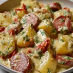 This Creamy Smoked Sausage & Potato Crockpot Dinner is a comforting, hearty meal perfect for busy days. Tender baby potatoes, smoky sausage, and a rich creamy sauce infused with garlic, thyme, and smoked paprika cook slowly to develop deep flavors all in one easy slow cooker dish.
