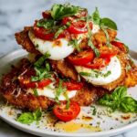 This Crispy Chicken Caprese recipe features juicy, breaded chicken breasts topped with fresh mozzarella, ripe tomatoes, and fragrant basil leaves, all finished with a sweet balsamic glaze. Combining the textures of crispy chicken with melty cheese and fresh produce, it’s a flavorful and elegant dish perfect for a quick weeknight dinner or entertaining guests.