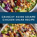 A vibrant and crunchy Asian Sesame Chicken Salad combining tender shredded chicken, fresh mixed greens, and colorful vegetables with a zesty sesame dressing, topped with crunchy almonds, wonton strips, and toasted sesame seeds for the perfect balance of flavors and textures.