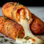 These Deep-Fried Shrimp Alfredo Burrito Bites combine succulent shrimp tossed in creamy Alfredo sauce and melted cheese, all wrapped in soft flour tortillas, then deep-fried to golden perfection for a crispy, indulgent appetizer or snack.