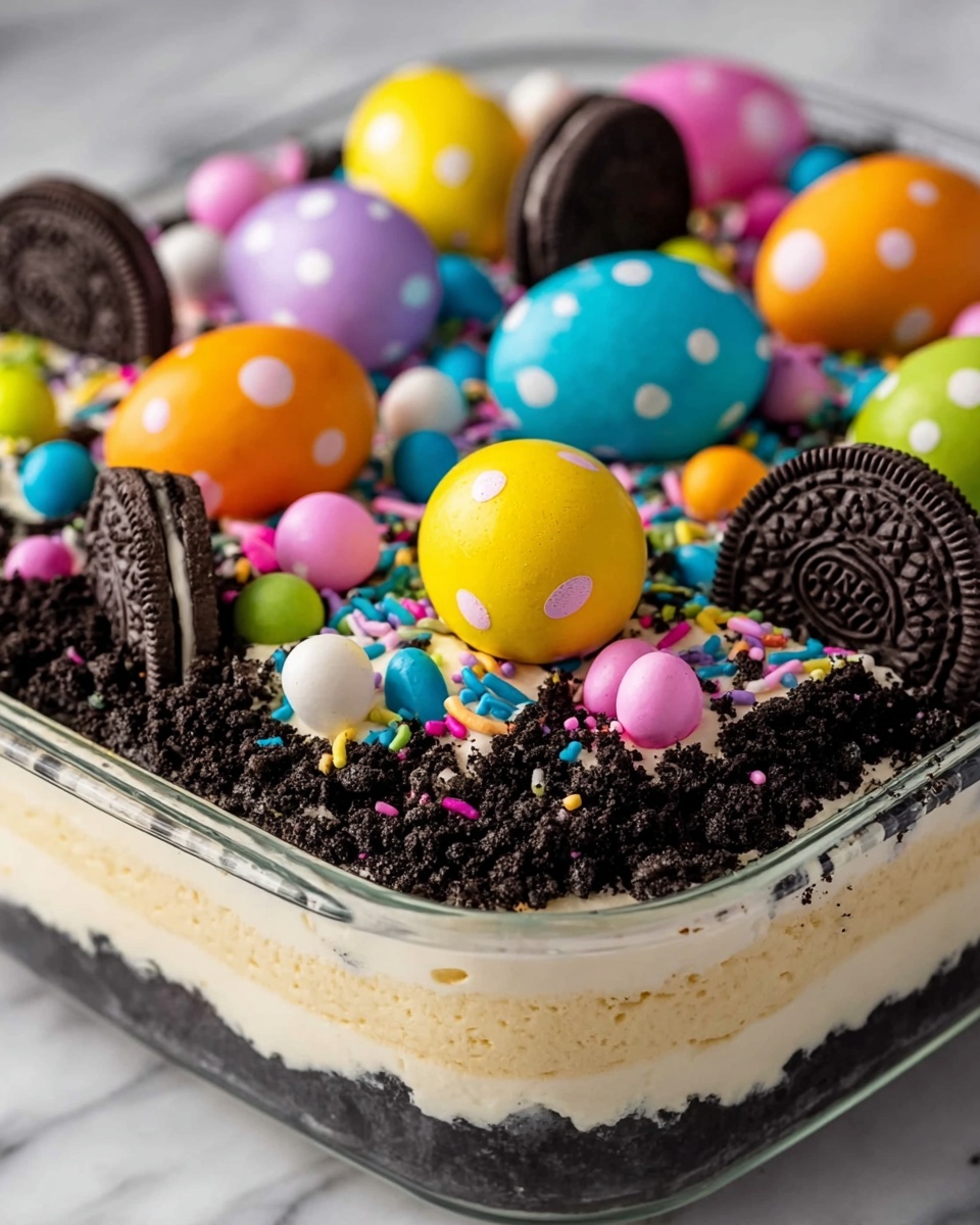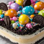 This festive Easter Dirt Cake is a fun and delicious dessert perfect for spring celebrations. Creamy and sweet, it layers Oreo cookie crumbs with a smooth vanilla pudding and cream cheese filling, topped with fluffy whipped topping and colorful Easter candies for a playful dirt-and-egg effect.