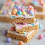 Remove the pan from the oven and immediately sprinkle the white chocolate chips evenly across the entire surface. Let them sit for a few minutes until melted, then spread the chocolate into a smooth, even layer using an offset spatula. If you want to add a pastel twist, mix 1 to 2 drops of gel food coloring with the melted chocolate before spreading. Before the chocolate fully sets, generously sprinkle on Easter and spring-themed sprinkles and candies for that cheerful, festive look.