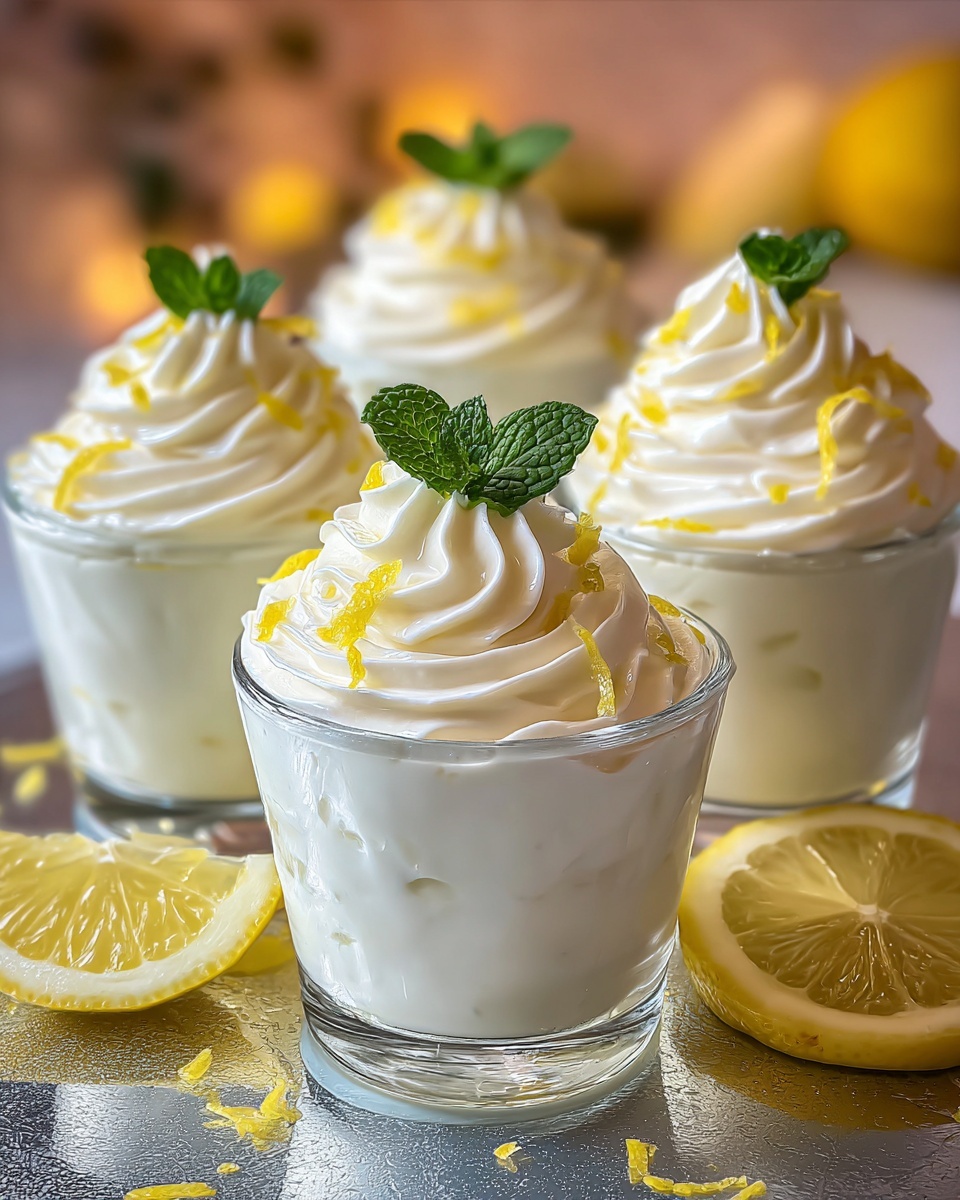 - Portion the Mousse: Spoon the lemon mousse into serving glasses or bowls and smooth the tops for a clean presentation.