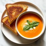 A comforting and flavorful easy tomato soup made with roasted tomatoes, fresh basil, and a touch of cream, served alongside crispy, gooey grilled cheese sandwiches. Perfect for a cozy meal that combines rich, caramelized flavors and classic comfort food.
