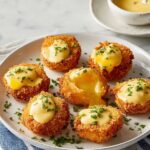 Crispy on the outside and creamy on the inside, these Fried Deviled Eggs offer a delicious twist on the classic appetizer. Hard-boiled eggs are halved, filled with a tangy, flavorful yolk mixture, breaded with panko and Parmesan, and then quickly fried to golden perfection. Garnished with fresh chives and paprika, they make a perfect savory bite served with hot sauce.