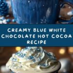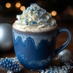 - Serve and garnish: Pour the cocoa into mugs, then top each with a generous swirl of whipped cream. Finish by sprinkling white chocolate shavings or blue sprinkles on top for a festive touch.
