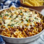 This Garlic Butter Ranch Beef and Roasted Corn Bowtie Casserole is a hearty and comforting dish that combines savory ground beef, creamy ranch seasoning, sweet corn, and tender bowtie pasta. Topped with melted cheddar cheese and baked to perfection, it offers a delicious blend of flavors and textures perfect for a satisfying family dinner.