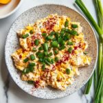 When the eggs are almost set but still slightly runny, gently fold in the finely chopped green onions and drizzle the sesame oil on top. Stir briefly until the eggs reach a creamy consistency. This last touch adds freshness, subtle crunch, and a wonderful nuttiness that transforms the dish from simple scrambled eggs into a flavorful experience.