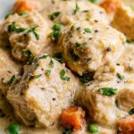 You can freeze this dish for up to 2 months. It’s best to freeze the components separately—store the chicken and vegetables in one container and the dumplings in another. This way, you can reheat everything without the dumplings becoming soggy.