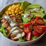 Now it’s time to build your salad bowl. Begin with a generous bed of romaine or mixed greens. Then layer on the diced avocado, chopped cherry tomatoes, crisp cucumber slices, and the smoky grilled corn. Finally, add the sliced grilled chicken on top. Each ingredient adds a unique texture and burst of flavor, making every bite exciting.