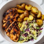 - Assemble Bowls: Arrange sliced grilled chicken on one side of the serving bowl, roasted potatoes on the other side, and fill the remaining space with the dressed veggie slaw.
