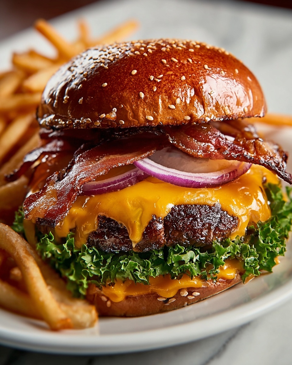 - Assemble burgers: Layer the toasted buns with lettuce, tomato slices, pickles, the cheeseburger patty, crispy bacon, and the fried egg on top.