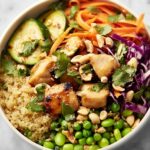 Now for the fun part—assembling your Healthy Thai Coconut Quinoa Bowls Recipe! Divide the coconut quinoa evenly among your serving bowls. Top each bowl with the sautéed vegetables, then add fresh shredded red cabbage and cucumber slices on the side for that refreshing crunch. Drizzle a generous amount of the homemade peanut sauce over the top. Finally, sprinkle with chopped cilantro, green onions, and roasted peanuts for a burst of color, flavor, and texture that truly brings this dish alive.