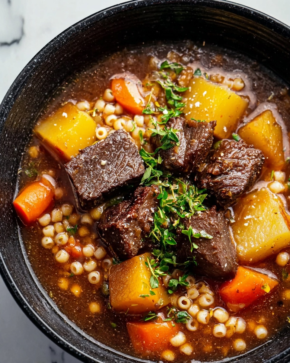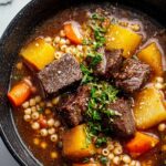 A hearty and comforting Beef and Barley Stew featuring tender beef cubes simmered with pearl barley, vegetables, and aromatic herbs in a rich beef broth. Perfect for a filling dinner that warms you up on chilly days.