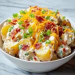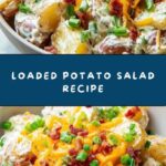 This Loaded Potato Salad is a creamy, flavorful side dish perfect for BBQs, potlucks, or summer picnics. Tender diced red or Yukon gold potatoes are combined with crispy bacon, sharp cheddar cheese, and a tangy dressing made from sour cream, mayonnaise, and Dijon mustard. Garnished with fresh green onions or parsley, this salad offers a delicious twist on a classic favorite.