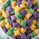 Presentation plays a huge role in the Mardi Gras spirit, so think fun and festive! Serve your Muddy Buddies in decorative bowls in purple, green, and gold hues, or portion them into mini clear cups with matching ribbon tied around for an easy grab-and-go party favor. You can even layer the different colored Muddy Buddies in a clear trifle bowl for an eye-popping centerpiece that looks almost too good to eat.