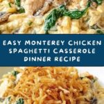 This comforting Monterey Chicken Spaghetti Casserole combines tender cooked chicken, creamy sour cream, savory cream of chicken soup, spinach, and Monterey Jack cheese baked together with spaghetti and topped with crispy French fried onions for a delicious, hearty meal perfect for family dinners.