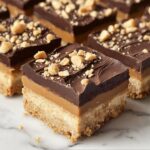 Once set, lift the bars from the baking dish using the parchment paper overhang. Cut into your desired sizes—squares or rectangles—and get ready to enjoy a rich, peanut-buttery, and chocolatey treat that’s silky and satisfying in every bite.