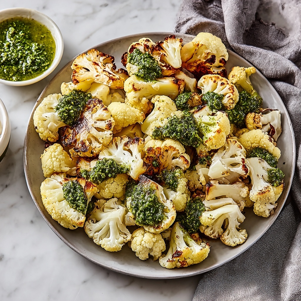 Once roasted, transfer the cauliflower to a serving dish, then drizzle the remaining pesto over the top. Sprinkle with extra grated Parmesan for that final cheesy flourish. This finishing touch adds a creamy contrast to the warm roasted flavors and makes the dish look as fantastic as it tastes.