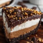 This Peanut Butter Chocolate Mud Pie is a luscious layered dessert featuring a crunchy Oreo crust, a rich semi-sweet chocolate filling, a creamy peanut butter layer, and a silky white chocolate ganache topping. Perfectly balanced between chocolate and peanut butter flavors, this pie is baked to perfection and chilled for a decadent, indulgent treat.