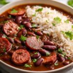 A classic Louisiana Creole dish featuring tender red kidney beans simmered with andouille sausage and the aromatic ‘holy trinity’ of onions, celery, and bell pepper, seasoned with Cajun spices, and served over fluffy white rice. Perfect for a comforting and flavorful meal that captures Southern soul food tradition.