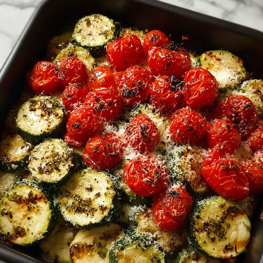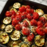 A simple and flavorful recipe featuring roasted zucchini, cherry tomatoes, and garlic, topped with Parmesan cheese and Italian seasoning for a delicious vegetable side dish.