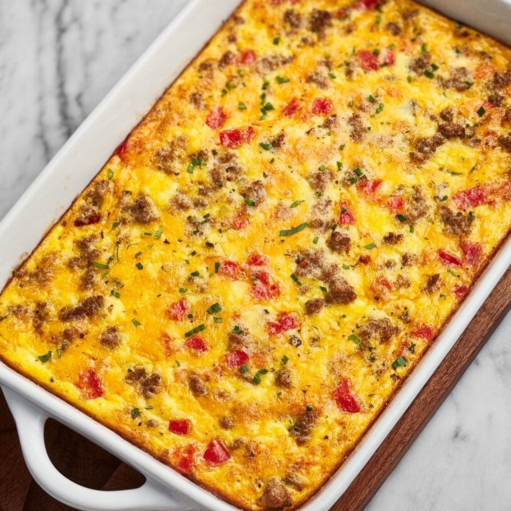 - Assemble Layers: Layer the cooked sausage mixture evenly over the hash browns in the baking dish. Then sprinkle the shredded cheddar cheese evenly on top of the sausage layer.