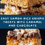 Delight in these irresistible Samoa Rice Krispie Treats, a luscious twist on the classic marshmallow snack. With layers of toasted coconut, gooey caramel, and rich chocolate drizzle atop crispy Rice Krispies, this treat perfectly mimics the flavors of the beloved Samoa cookie in an easy, no-bake bar form. Perfect for parties or a sweet snack, these bars combine crunchy, chewy, and creamy textures in every bite.