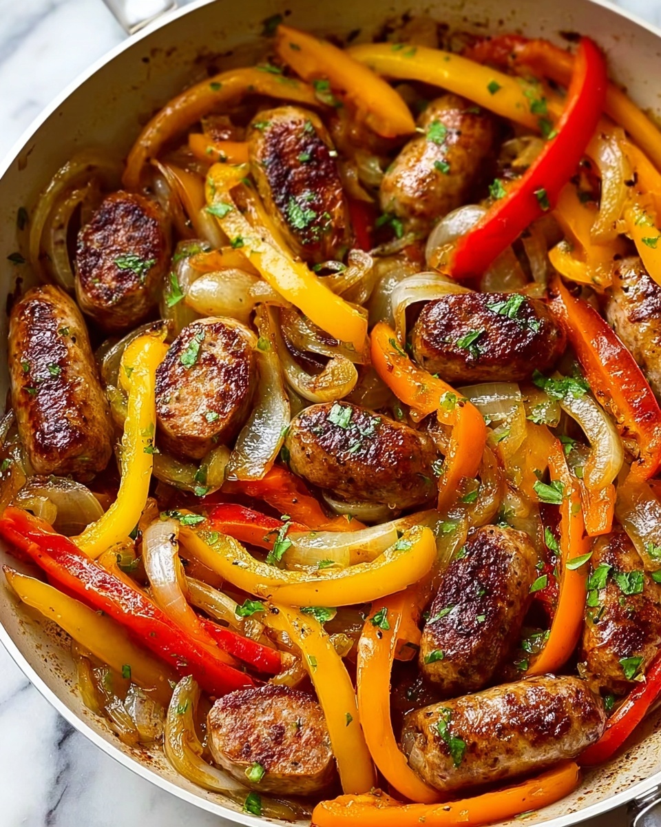 This Sausage and Peppers Skillet is a vibrant, flavorful one-pan meal featuring savory andouille sausage sautéed with colorful bell peppers and onions, seasoned with Italian herbs and garlic. Ready in just 30 minutes, it’s perfect for a quick, hearty dinner.