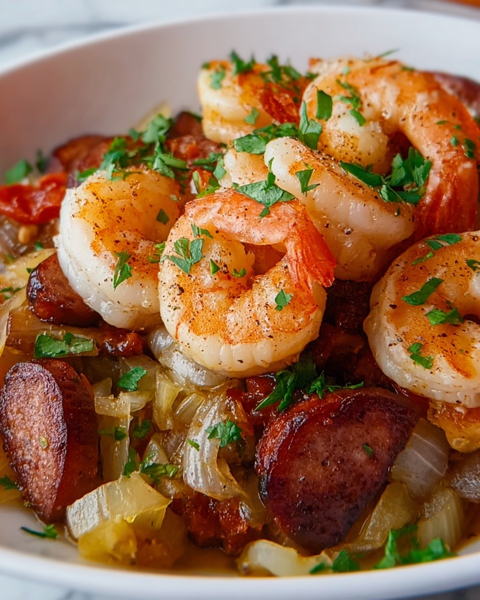 A hearty and flavorful Shrimp and Sausage Cabbage Bowl featuring tender shrimp, smoky sausage, and sautéed cabbage seasoned with smoked paprika and garlic spices. This quick and easy stovetop dish is perfect for a satisfying weeknight meal, combining protein and vegetables in a well-seasoned, wholesome bowl.