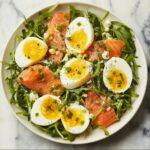 Tear the smoked salmon into bite-sized pieces and arrange them generously over the salad. Then add the creamy avocado slices, whose buttery softness merges effortlessly with the smoky fish. This combination offers a luxurious mouthfeel that makes this salad satisfying without feeling heavy.