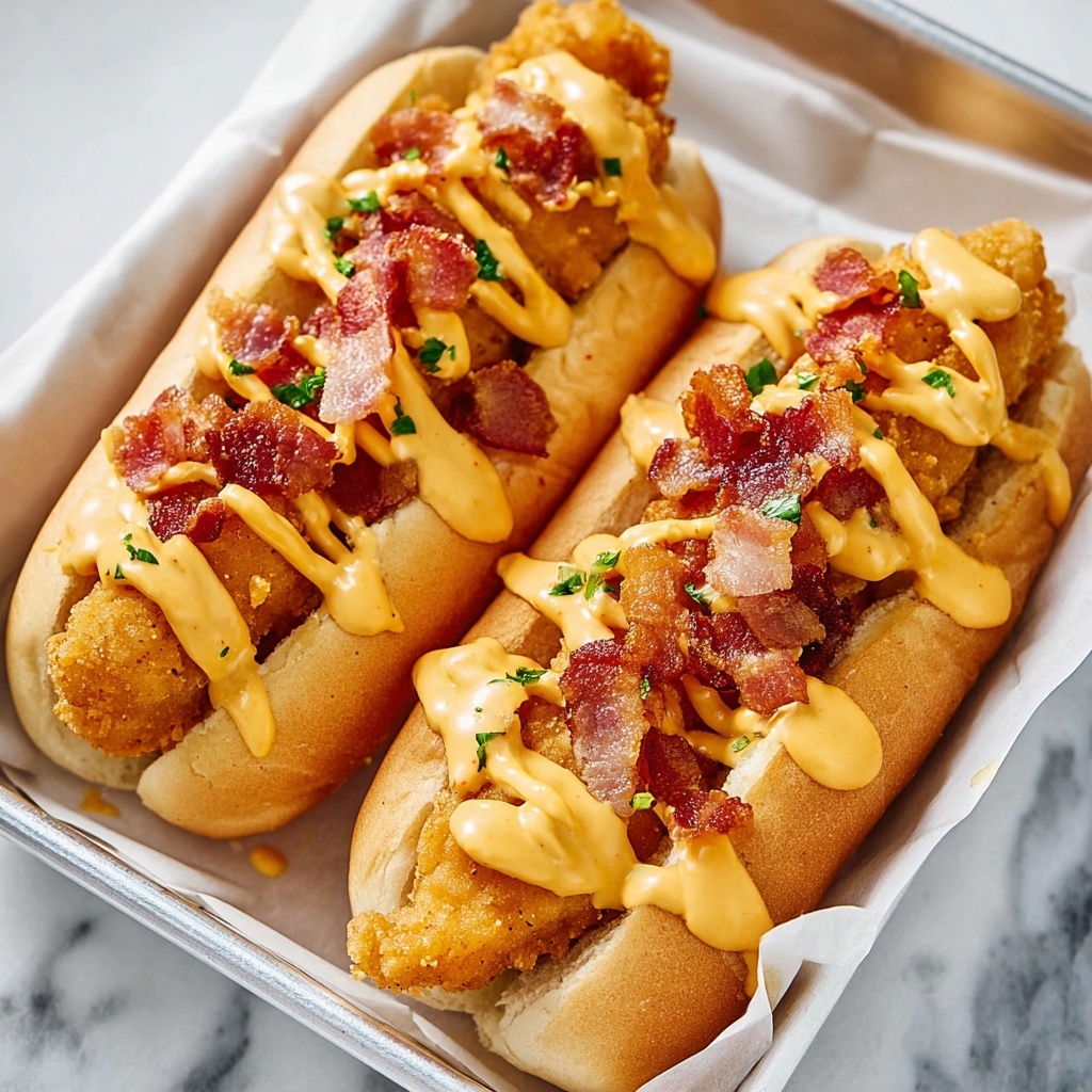 - Assemble Sandwiches: Open each hot dog bun and layer a chicken tender inside. Sprinkle crumbled bacon evenly over the chicken, then top with shredded sharp cheddar cheese.