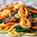 A flavorful and quick steak and shrimp stir-fried noodle dish combining tender flank steak, succulent shrimp, and fresh vegetables tossed in a savory Asian-inspired sauce. Perfect for a satisfying weeknight dinner that balances protein, vegetables, and noodles in a vibrant, tasty meal.