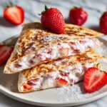 For a party, cut the quesadillas into smaller, bite-sized triangles and arrange them on a decorative platter with berries and edible flowers. You can also create a stacked dessert by layering multiple quesadilla wedges with alternating cream cheese and strawberry layers.