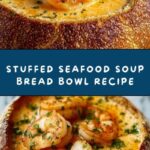 This comforting Stuffed Seafood Soup Bread Bowl features a rich and creamy seafood soup loaded with shrimp, crab, scallops, and fish, served inside crispy toasted sourdough bread bowls. The soup is packed with tender vegetables, aromatic herbs, and a hint of tomato paste, making it a hearty and satisfying meal perfect for seafood lovers.