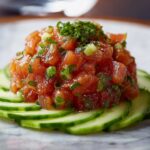 This Sweet Chermoula Tuna Tartare is a vibrant, fresh appetizer that combines sushi-grade tuna with a flavorful chermoula marinade infused with cumin, smoked paprika, and honey. Enhanced with herbs like cilantro and parsley, and a touch of citrus, this dish offers a perfect balance of savory, sweet, and spicy notes, making it a sophisticated and healthy starter ideal for warm weather or elegant gatherings.